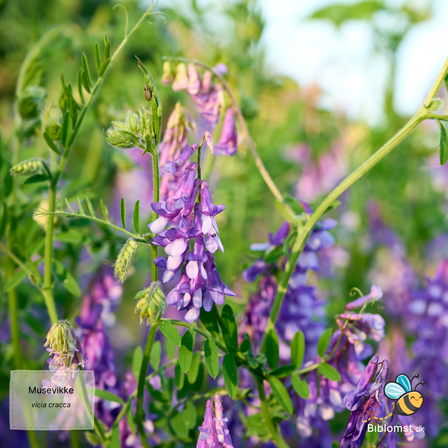 Musevikke (Vicia cracca) er en hjemmehørende dansk vildplante, der vokser naturligt i vejkanter, engkanter, langs stengærder og i lysåbne skovbryn over hele landet. Den er en af de mest almindelige danske ærteblomstplanter – og en af de mest oversete. For de fleste er den blot en del af vejkantens grønne baggrund, men stopper man op og kigger nærmere, afslører den tætte, ensidige klaser af blåviolette blomster og et fint, fjerformet løv, der slynger sig elegant op gennem alt, hvad det kan gribe fat i. Som flerårig blomsterfrøplante til naturhaven er musevikke noget af det bedste, du kan så for bierne og for den danske biodiversitet.