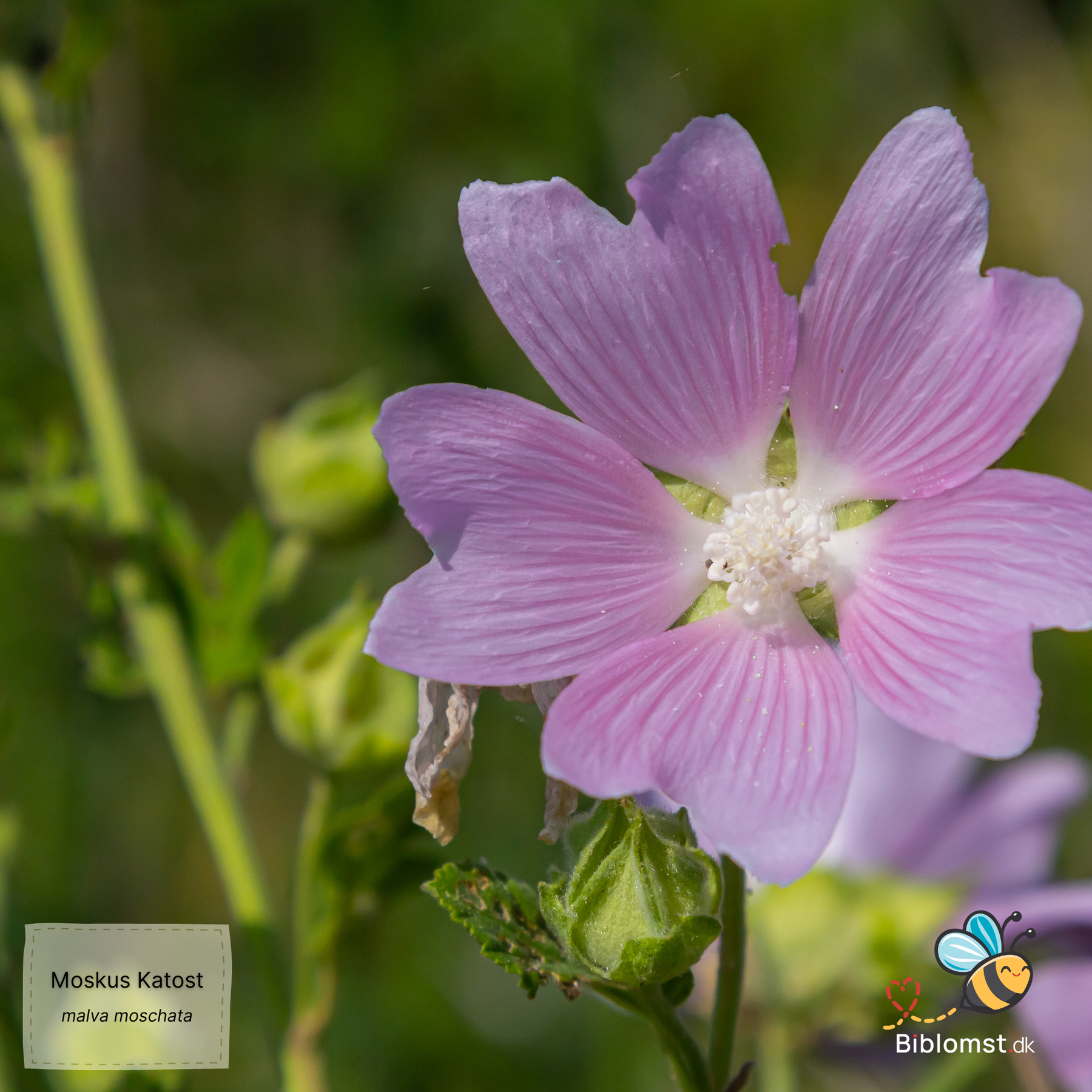 Moskuskatost (Malva moschata) er en ægte dansk vildplante, der vokser på overdrev, solrige vejkanter og tørre skrænter i det meste af landet. Artsnavnet moschata – moskusduftende – beskriver den fine, varme duft, der stiger op fra bladene på en solrig dag, især når man gnider dem mellem fingrene. Det er en beskeden, ukompliceret plante med en skønhed, der sniger sig ind: brede, åbne blomster i blød rosa, fint fligede blade og en lang, stabil blomstring, der holder hele sommeren. Den beder ikke om opmærksomhed, men den får den alligevel.
