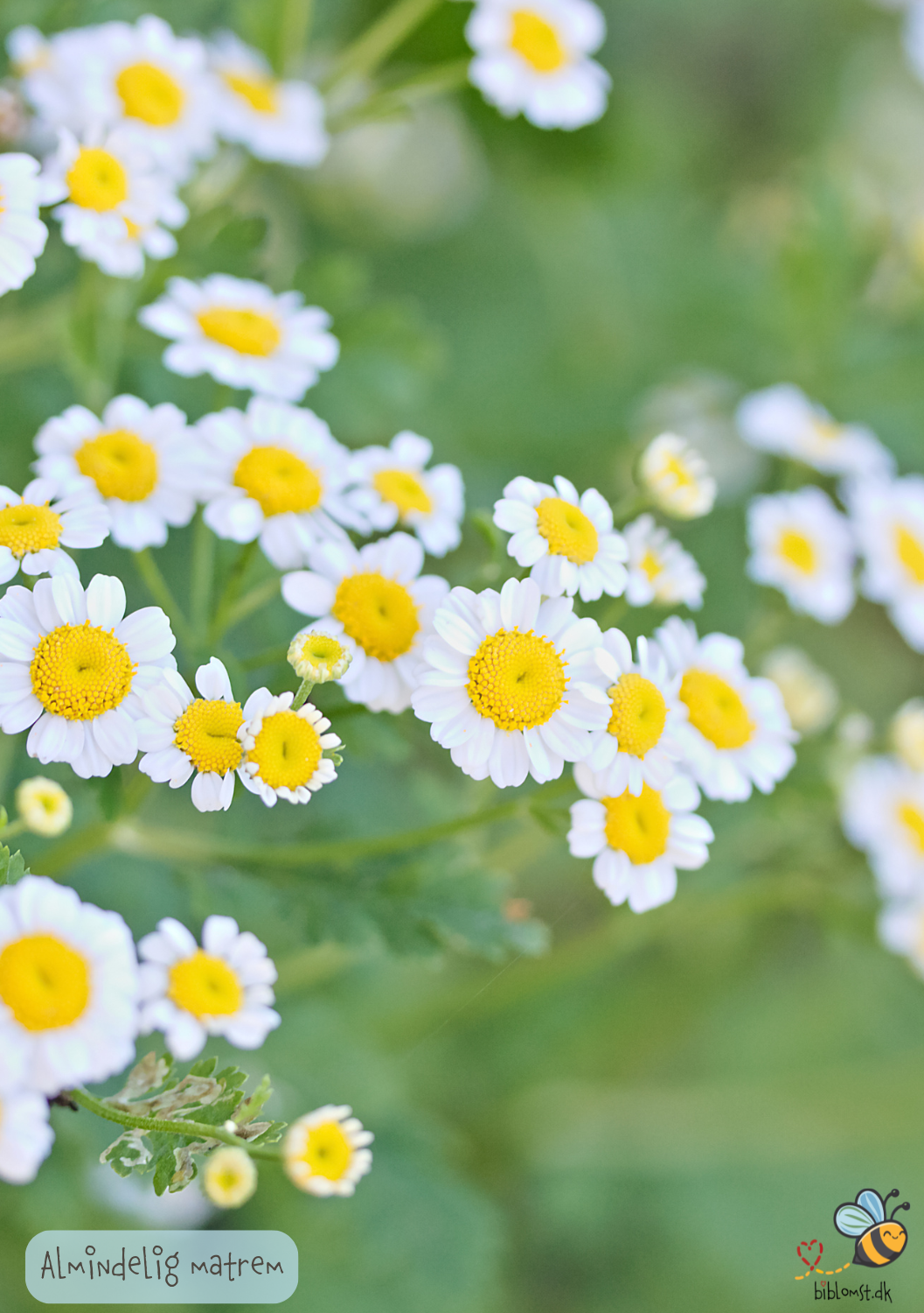 Almindelig matrem (Chrysanthemum parthenium) er en flerårig plante med små, margueritlignende blomster og friskgrønt løv. Blomstrer fra juni til august og er både dekorativ og nyttig i haven. Matrem er kendt for sine medicinske egenskaber og bruges traditionelt mod hovedpine. Planten trives i fuld sol og veldrænet jord, hvilket gør den nem at dyrke og en smuk tilføjelse til enhver have.