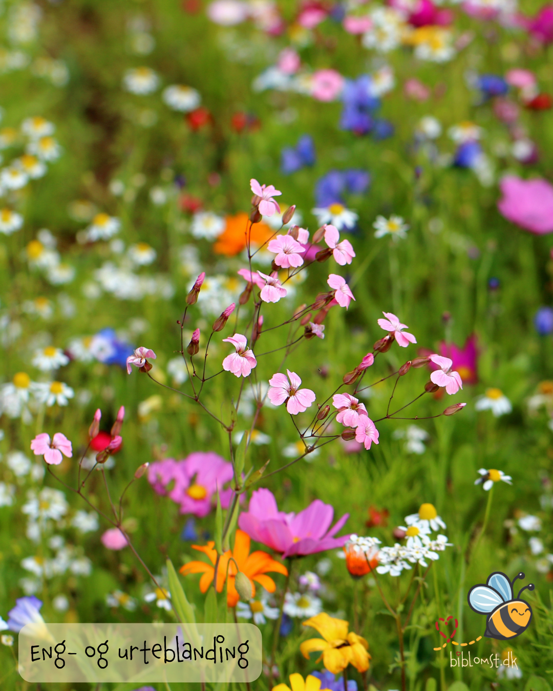 Artsrig, naturpræget blanding i hvide, gule, blå og purpur/pink toner. Velegnet til solrige kanter, læhegn og den vilde del af haven. Blomstrer i danmark fra juni–september.