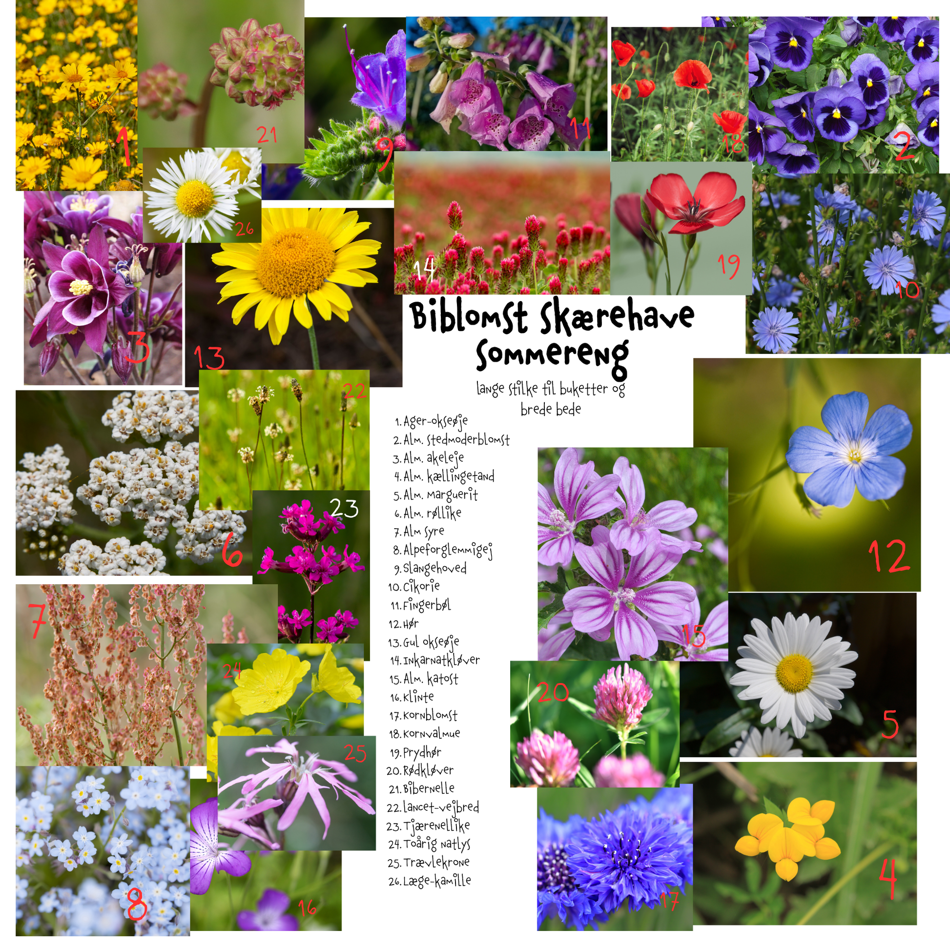 13 af 28 arter er hjemmehørende i Danmark; blandingen er derfor ikke hjemmehørende. Rummer etårige, toårige og stauder.